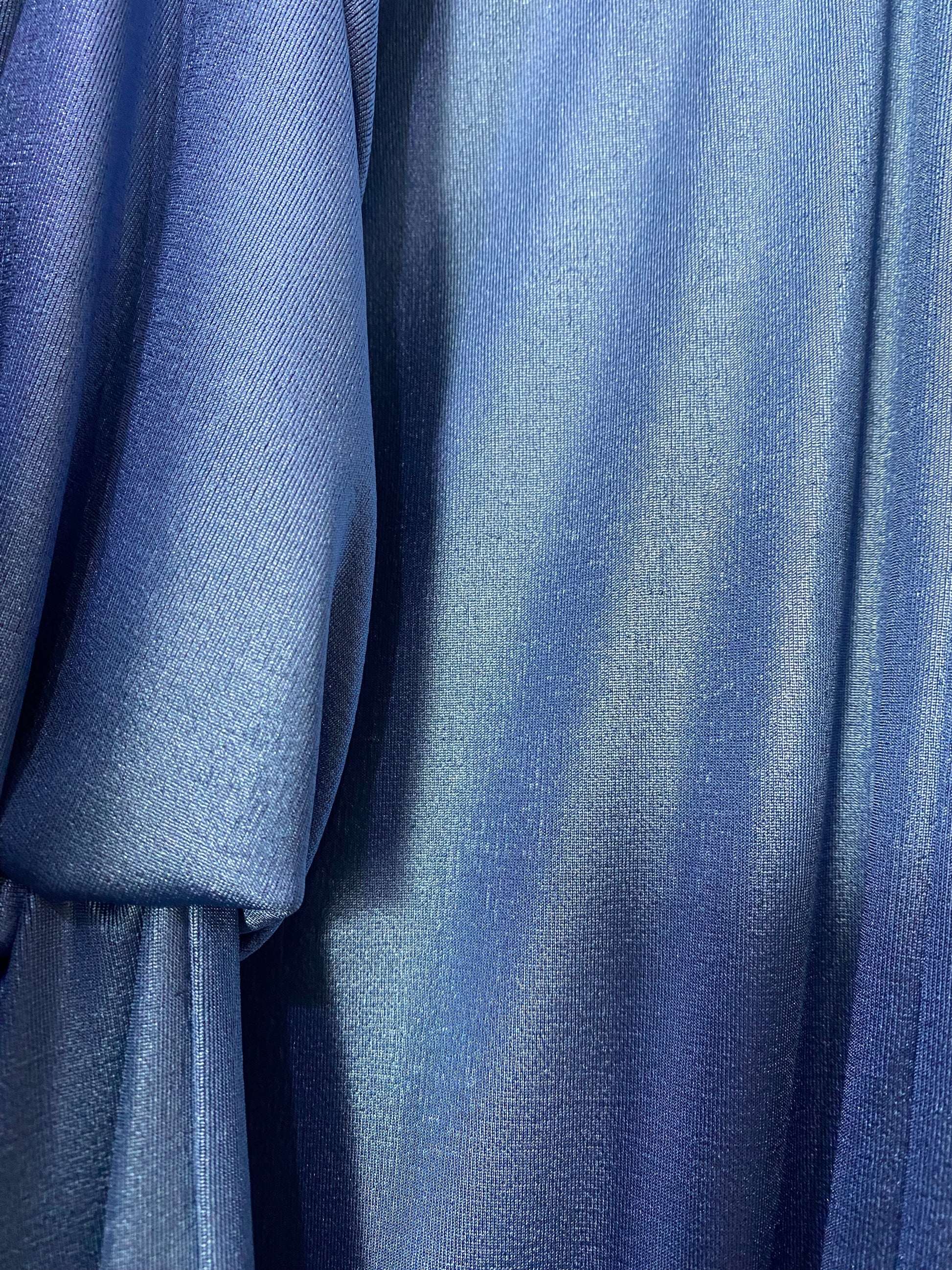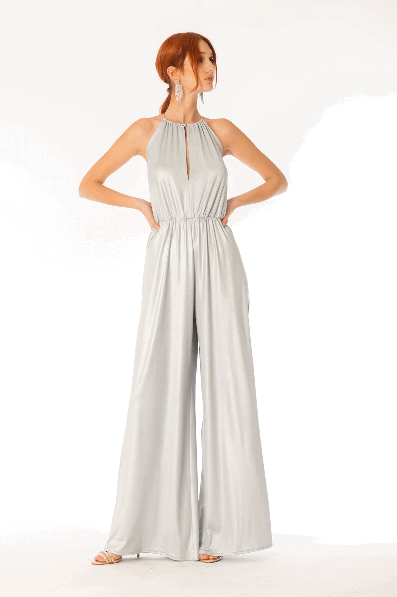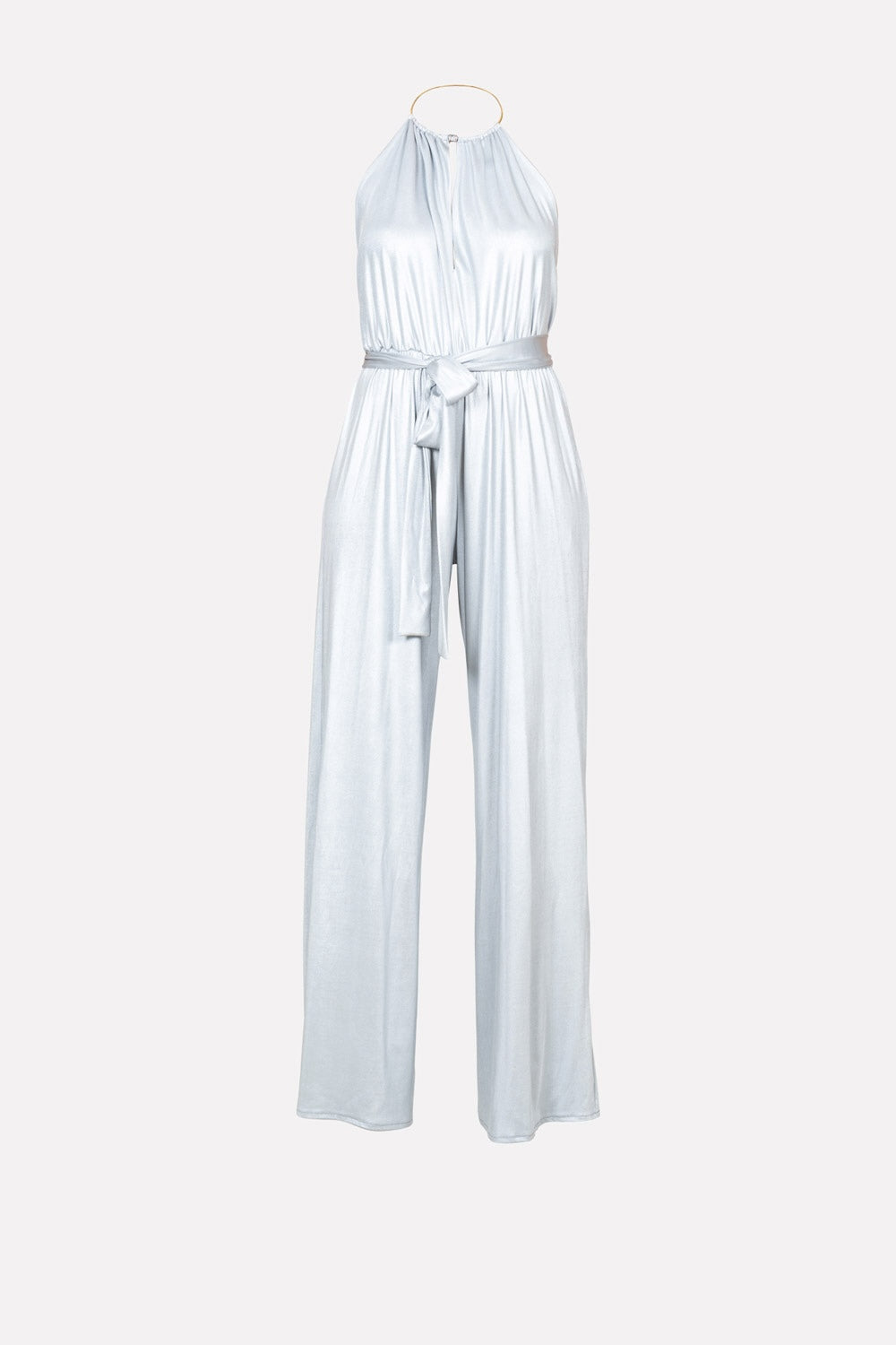 Tuta con collana , spacchi , elastico in vita e cintura dello stesso tessuto. Colore fiordaliso