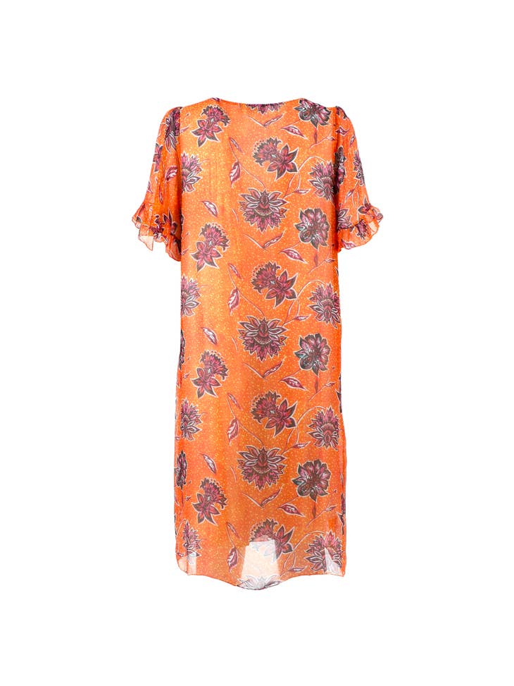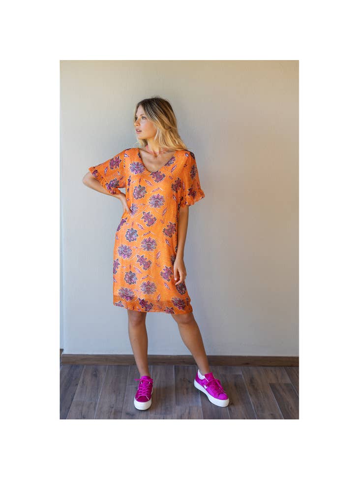 Vestito corto in chiffon misto seta stampato, modello ampio, con scollo tondo e maniche corte. Fodera interna a canotta in tinta unita color giallo zafferano. Targhetta Karakorum in metallo.